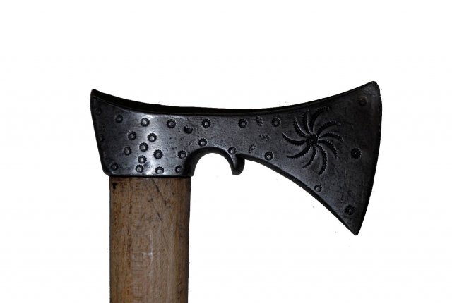 The axe consists of a steel hatchet and a wooden handle. The hatchet has a vertical edge with a characteristic tongue at one side of the axe. The central surface of the hatchet is decorated with a rosette with the use of stamps. The axe has also a simple handle with an edge which is strengthened with thimble. |